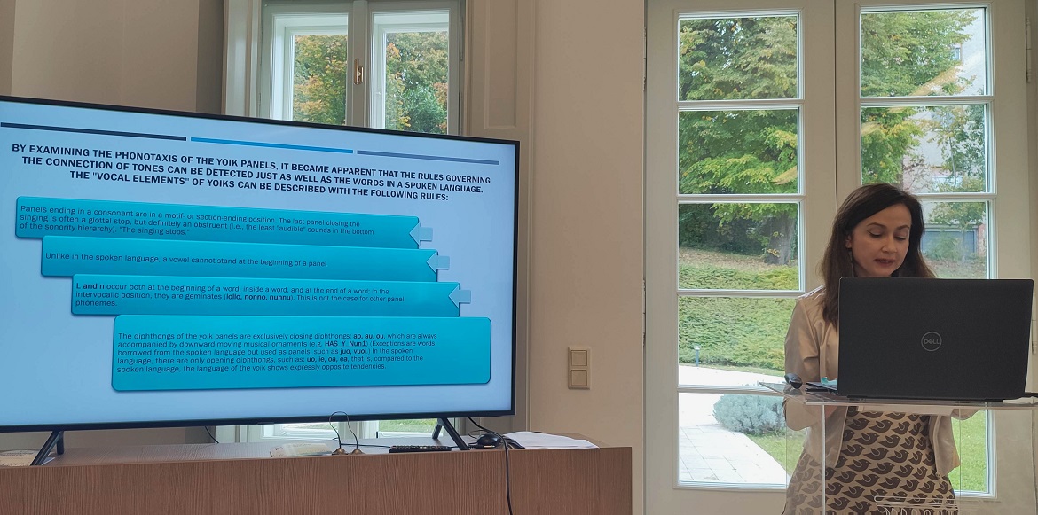 Az előadó bemutatta, hogy a nonszensz szavak és szövegek felépítését is fonotaktikai és grammatikai szabályok határozzák meg, ezért sok tekintetben „nyelvként” érthetők és elemezhetők. A jojkák a számik kultúrájában a mindennapi és a rituális kommunikációban is a beszéddel összemérhető szerepet töltenek be. Mindez különösen érdekes a kisebbségi helyzetből adódó többnyelvű környezetben, ahol a jojka belső és interetnikus diskurzusokban kialakult kódrendszere nemcsak egyezéseket mutat a használók anyanyelvével, hanem számos vonatkozásban el is tér attól. Az idegen nyelvi hatások fonológiai szinten megragadható érzelmi jelentésekkel, belső kódokként épülnek be a jojkák kommunikációs struktúrájába.