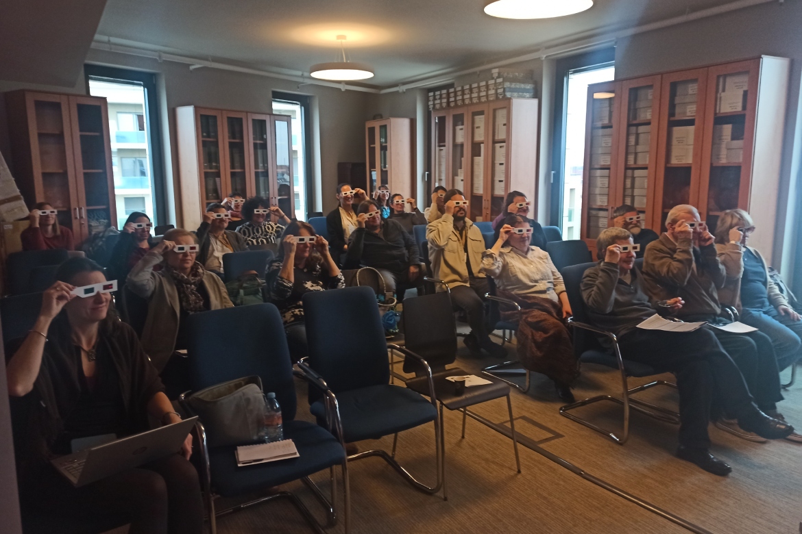 Sztereó diapozitívokat szemlél a közönség 3D-szemüvegben Szegedy-Maszák Zsuzsanna előadása alatt. Fotó: Bata Tímea